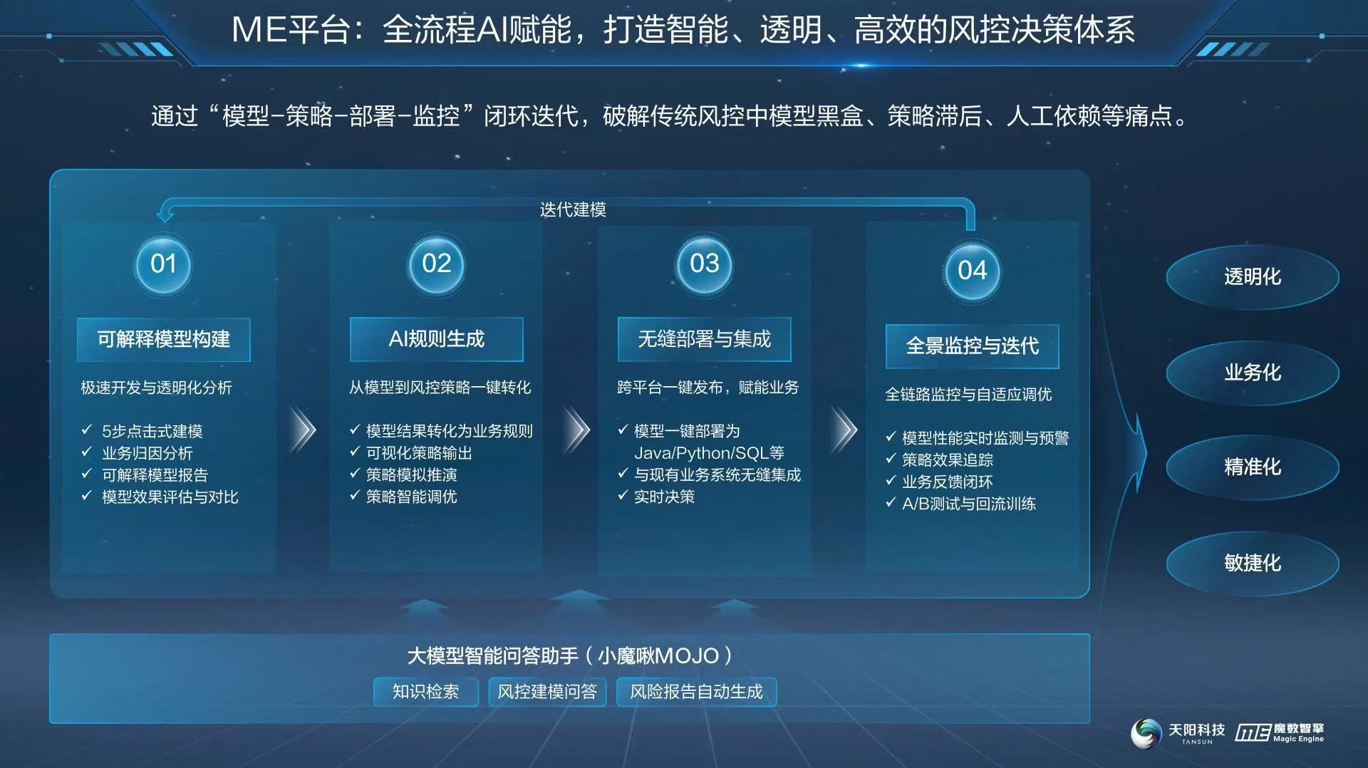 期间,天阳科技、魔数智擎与华为三方联合推出的金融数智融合平台同步亮相。其中由魔数智擎提供的可解释、业务化金融智能建模平台(以下简称 ME),有效解决了银行模型开发与应用中的痛点,助力金融机构构建透明、敏捷的决策智能体系,为数智化转型筑牢核心底座支撑。